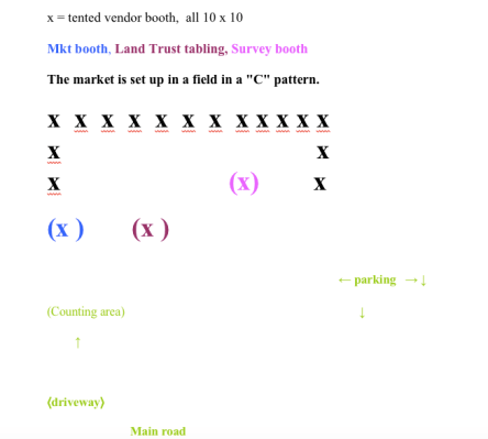 This market organization has collected data previously and has devised an almost fool-proof way to count their visitors. Since the parking is routed from the main road via a narrow drive to a graveled area, they can position someone at the beginning of the drive, counting every car and the number of adults inside. Additionally, it also allows the market to collect the license plate state which is extremely important as Cindy says that the attendance for this weekday market usually about 50% Vermonters.