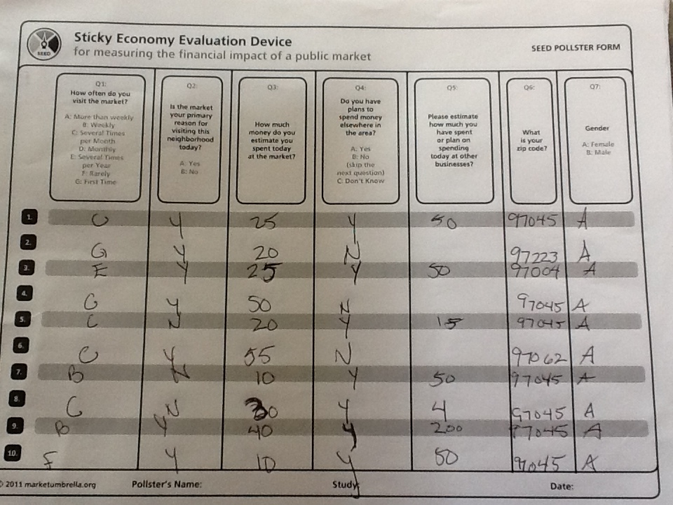 study in Oregon City, Oregon. Market manager Jackie Hammond-Williams puts together an amazing market every few days and has a lot of fun while she does it. Look for my upcoming FMC newsletter story about the study day and how this economic tool measures a markets impact. AND you’ll be able to read the report too – which was ready the next day. I guess we’ll let OCFM look at it first but I’m sure they will have it on their website very soon, and it will be followed by their weekday market SEED report too.